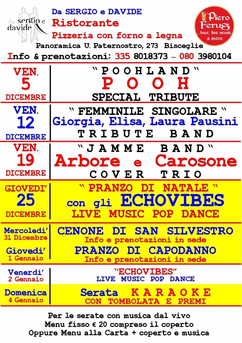 Ogni venerdì sera il ristorante-pizzeria ‘da Sergio e Davide’ propone appuntamenti musicali dal vivo dedicati ai successi italiani e internazionali, creando un’atmosfera ideale per chi ama ascoltare buona musica mentre gusta piatti tipici e pizze.