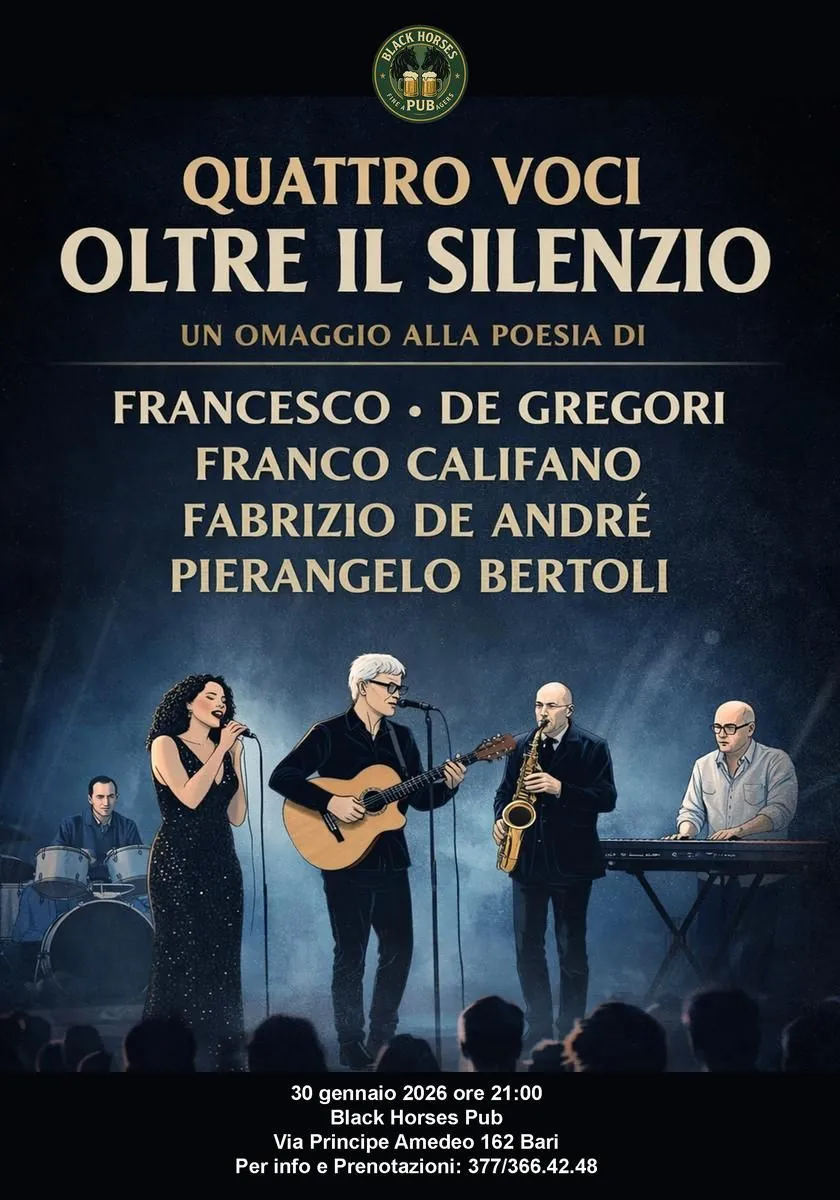 “4 Voci Oltre il Silenzio” è un concerto-spettacolo dedicato a rendere omaggio a quattro icone della canzone d’autore italiana: Francesco De Gregori, Franco Califano, Fabrizio De André e Pierangelo Bertoli.