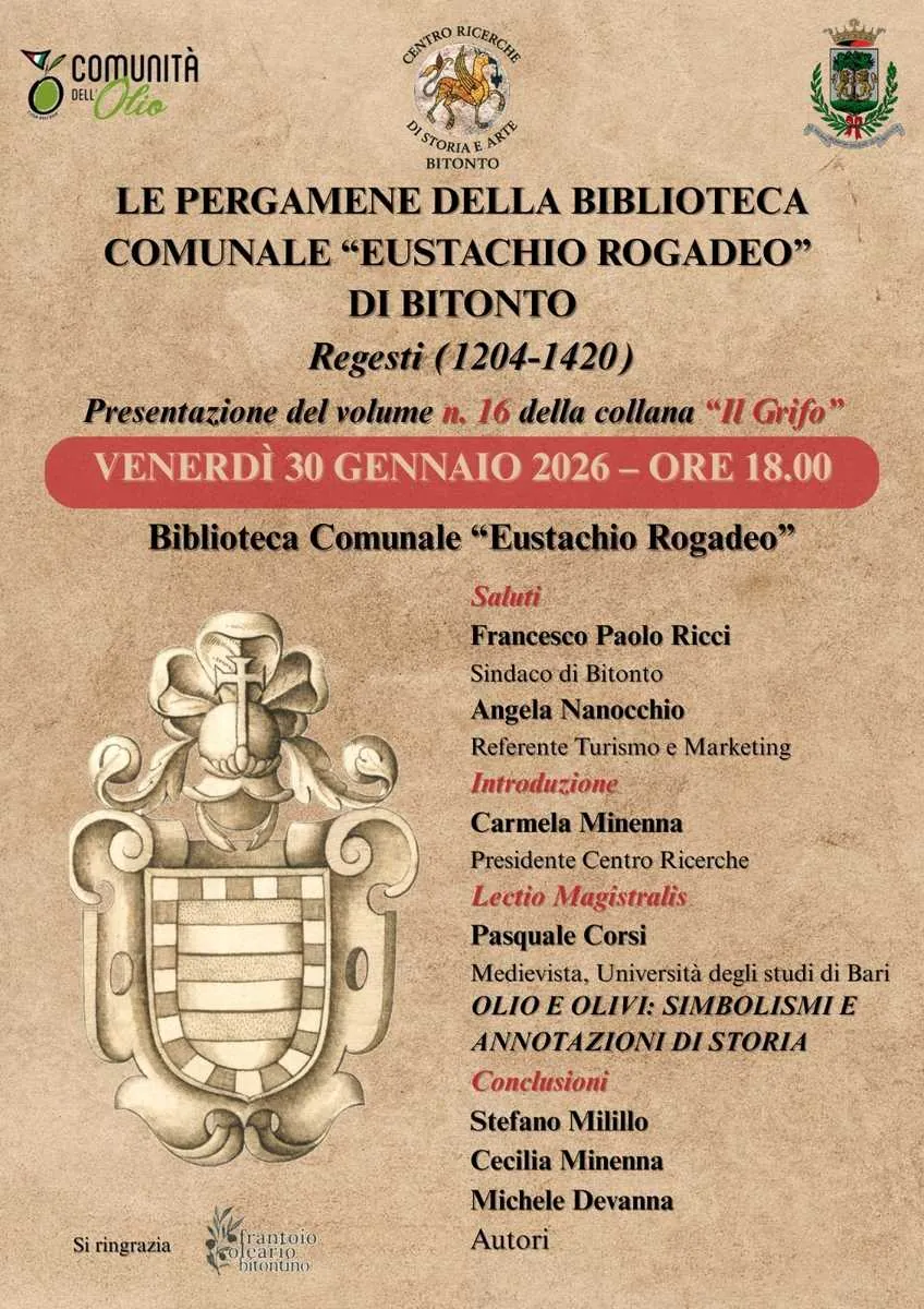 La presentazione della sedicesima pubblicazione della collana ‘Il Grifo’, affidata al Centro Ricerche di Storia e Arte di Bitonto, approfondisce la storia medievale locale attraverso le pergamene conservate nella Biblioteca Eustachio Rogadeo.